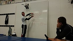 Daniel Sundell, Hammarbygymnasterna, instruerar i uppbyggnaden av ett PowerFit-pass. Initiativtagare Eddie Olsson lyssnar intresserat.